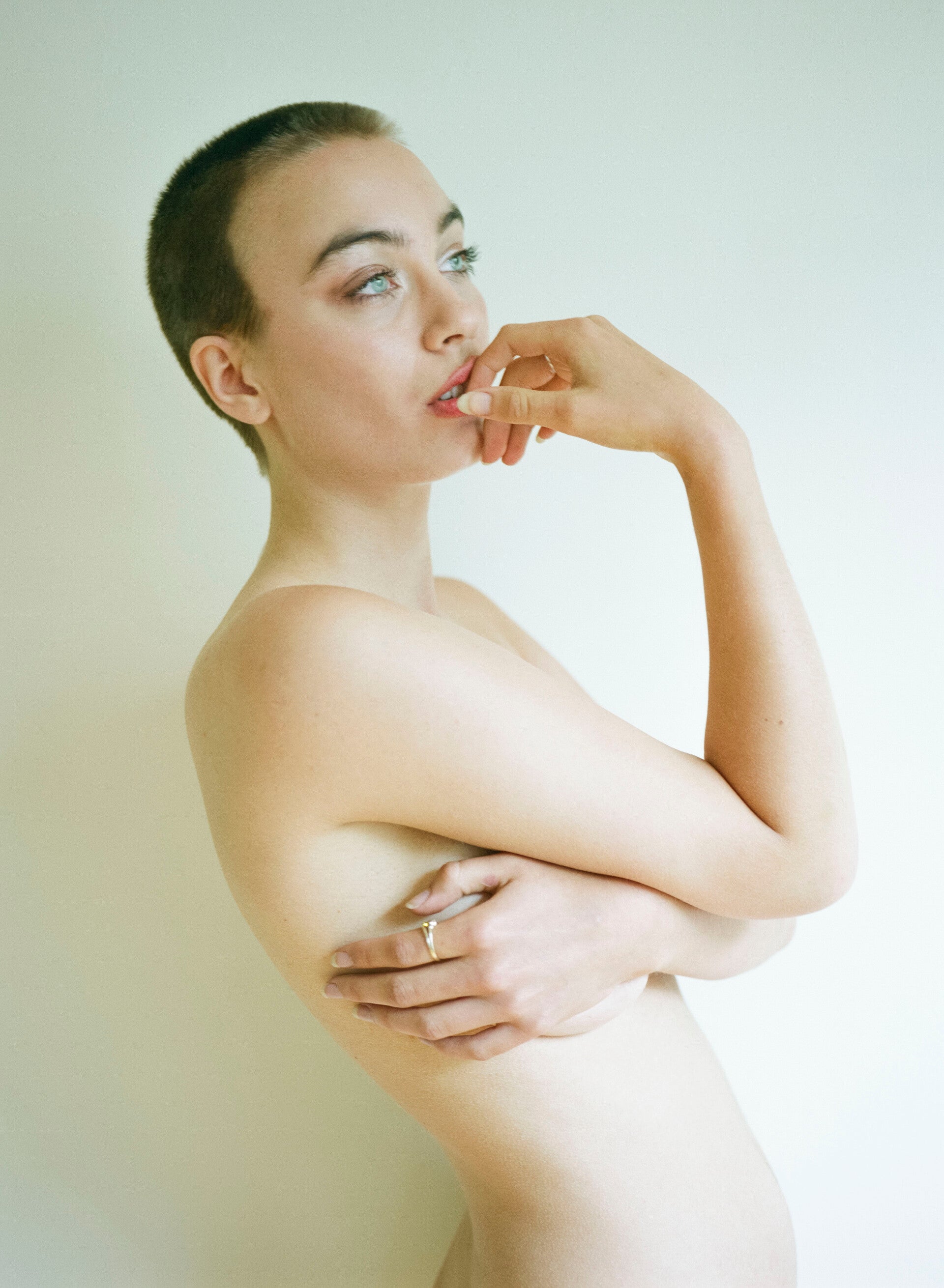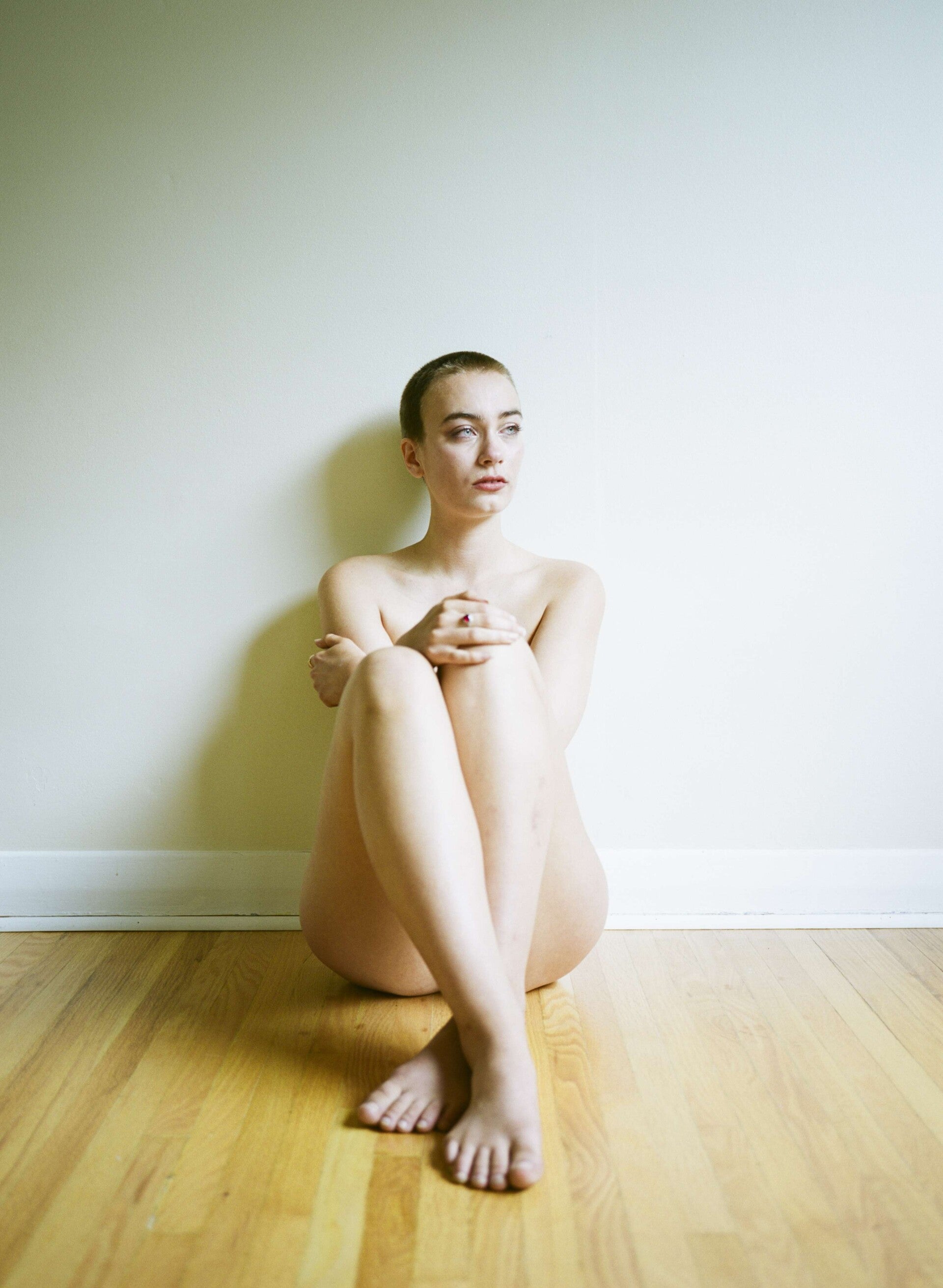 Cricket Guest was an award winning beauty queen at the time of the shoot ,winning the World Beauty Organization’s Top Model Of The World Canada pageant. But en route to the world final she stopped off at Jennifer's studio to shave her head and pose naked in an act of defiance against the beauty pageant industry. Today she is active in Indigenous justice & a human rights activist, filmmaker, actress, model and writer. We think we will write a little more on the background to this charged photoshoot another day and we will instead concentrate on the results of the photoshoot. It is fair to say for a women to shave her head it is a bold statement that she feels no longer forced to adhere to society's beauty standards that a woman should have long hair to be feminine. Whilst we would be lying if we said when we normally think of studying the female form she is often depicted with flowing hair as a sign of attractiveness this shoots proves we should all look deeper. One thing we notice is although she is totally naked in the photos her hand,arms and legs are placed to protect her modesty. The photos centre on her beautiful face, the skin head cut seeming to make us notice more her facial features particularly her amazing blue eyes framed by her long lashes and red lips contrasting against her exquisite pale skin seem to show an expressive and confident women. The 3rd picture although still showcasing her pretty face also invites the viewer to appreciate her fine body.