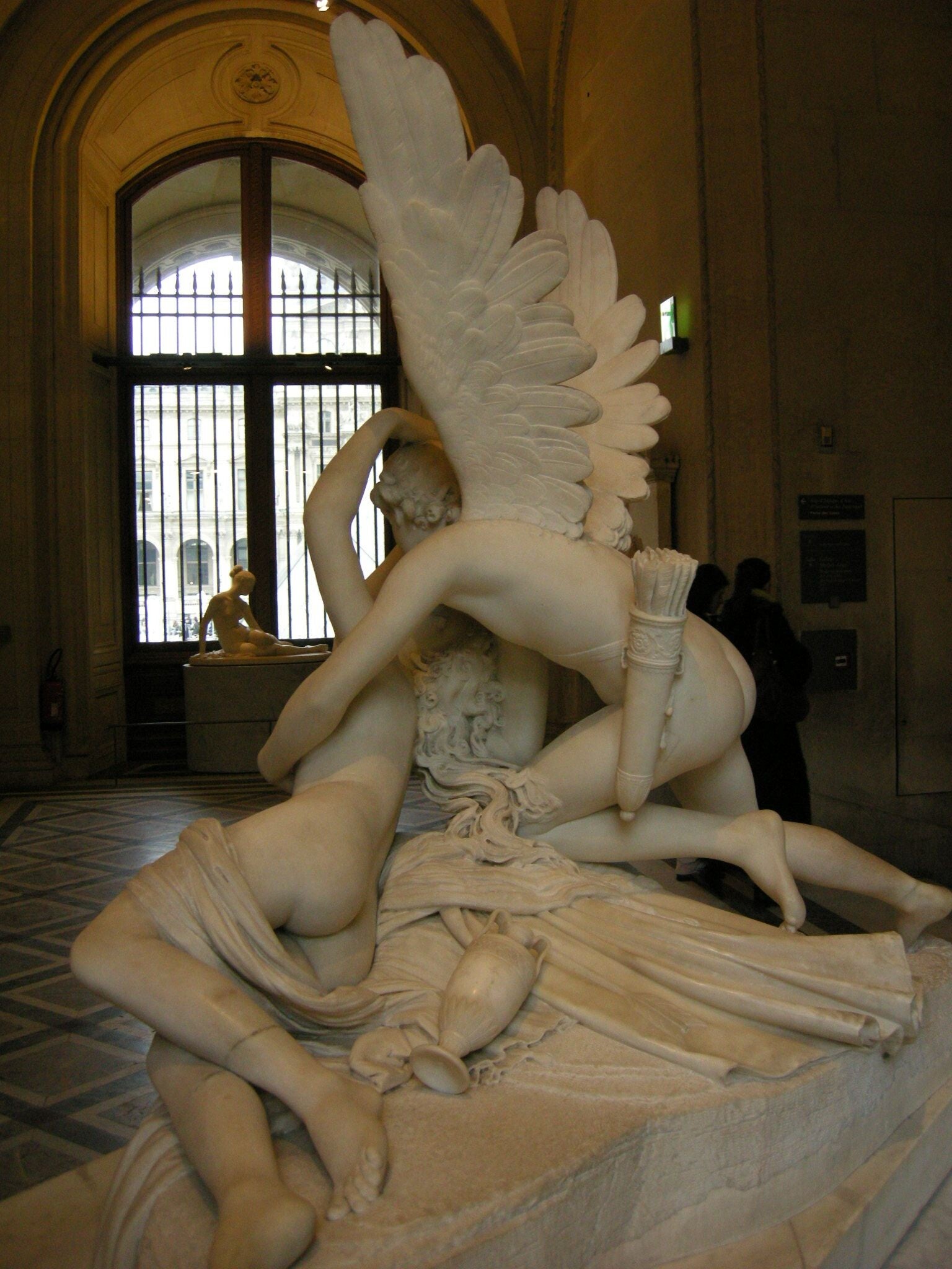 Looking at the sculpture from behind it is possible to admire the details of Psyche’s hair, the quiver of Cupid, i.e. the classic case that contains weapons such as darts and arrows, plus the vase that caused the girl to faint.