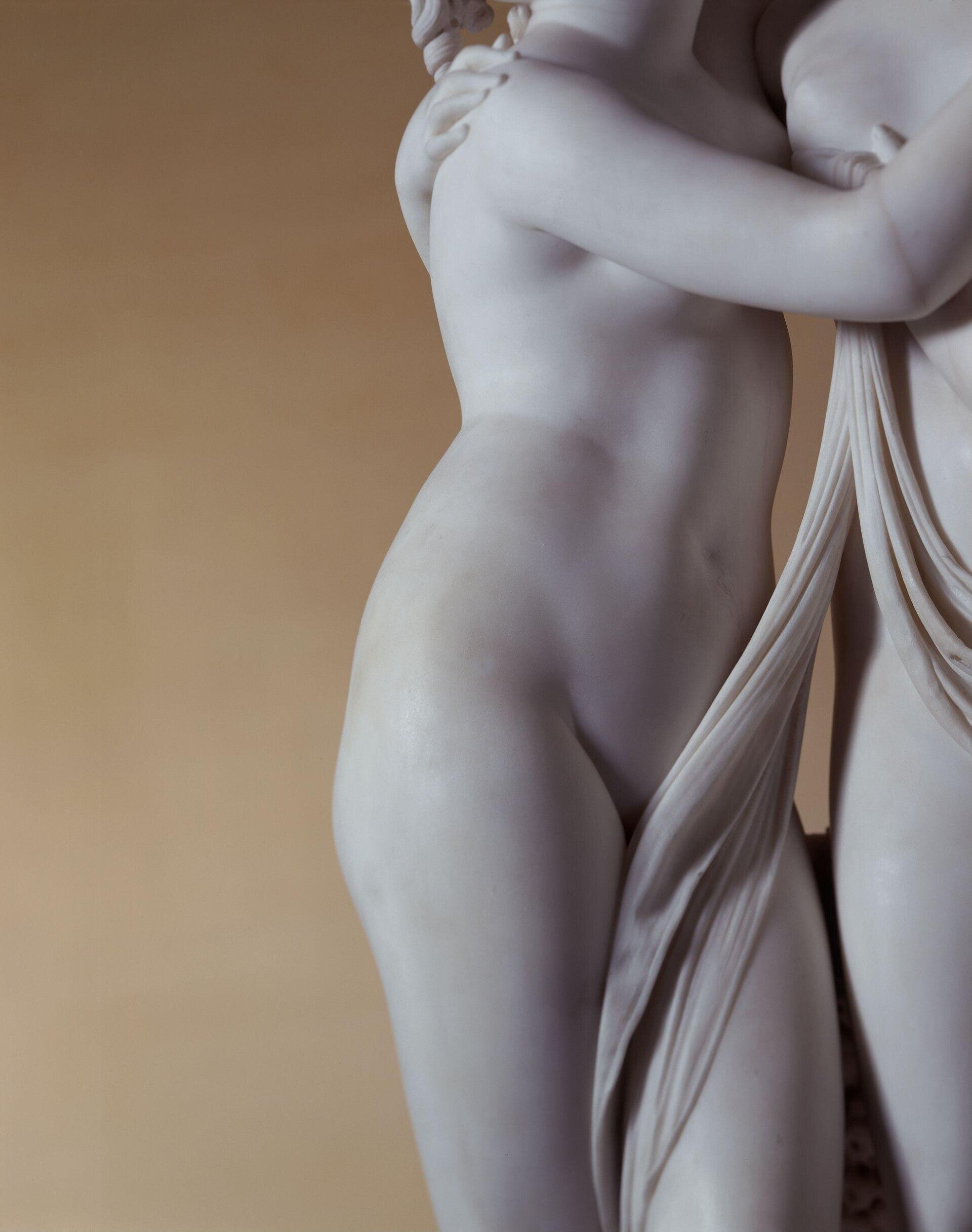 This astonishing work of art was commissioned by John Campbell. Looking at Cupid and Psyche embracing each other from the canonical point of view, i.e. from the front, one captures the harmony of the bodies that intersect in the loving embrace a moment before kissing, forming a sinuous and soft X, which leaves the work vibrating in the space.The four arms of the two lovers together form two circles that frame the faces to accentuate the very few centimeters that separate their lips from the kiss.