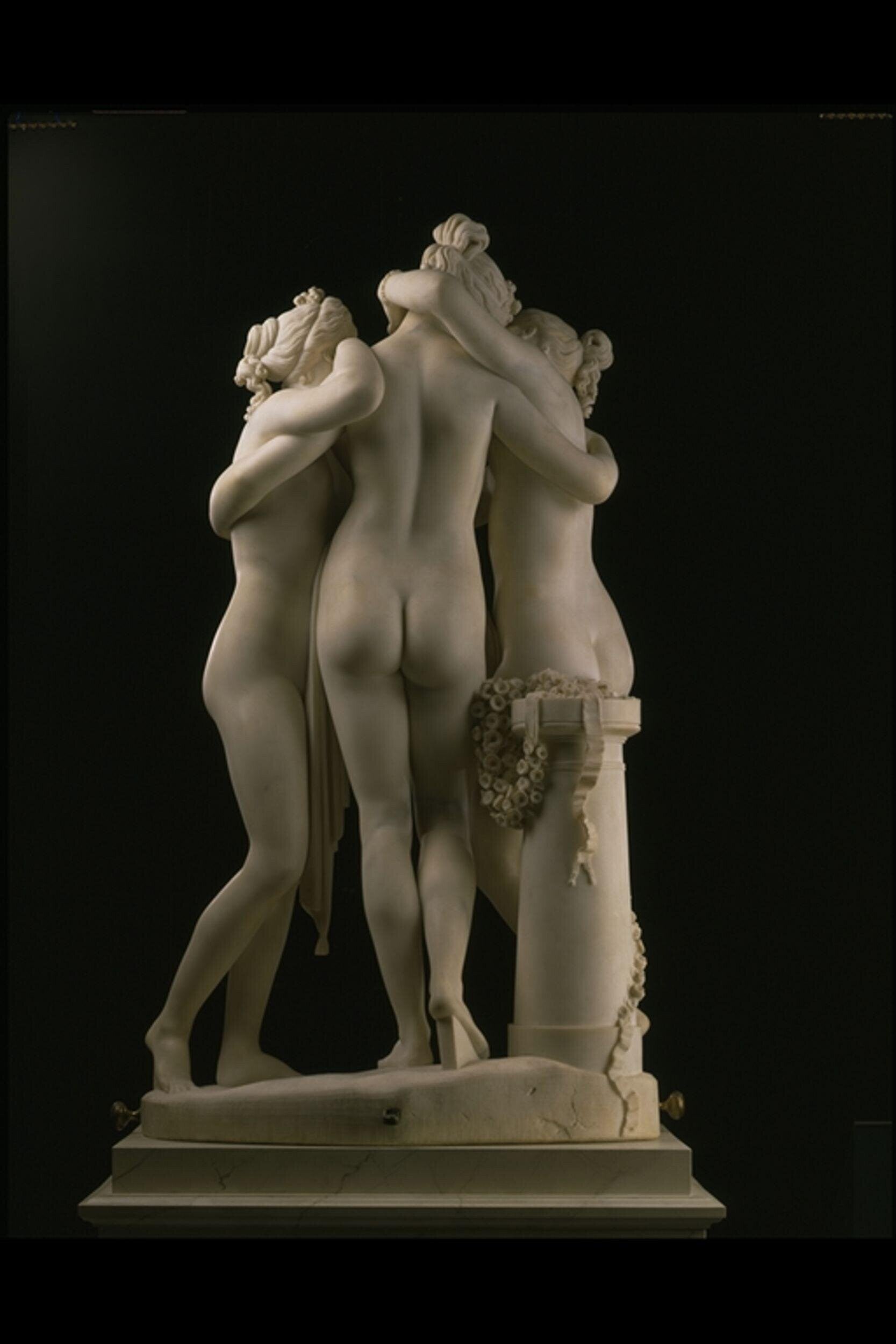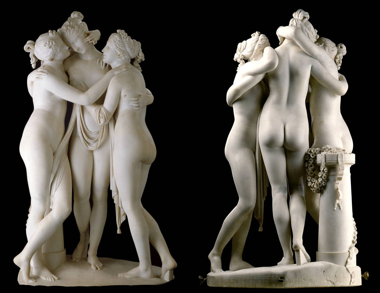 The Three Graces depicts the three daughters of Zeus, each of whom is described as being able to bestow a particular gift on humanity: (from left to right) Euphrosyne (mirth), Aglaia (elegance) and Thalia (youth and beauty). The first version of this piece was commissioned by one of the era's most famous women, Joséphine de Beauharnais, who was by then the divorced first wife of Napoleon. In May 1814, before Antonio Canova had completed the sculpture, De Beauharnais died. John Russell, the 6th Duke of Bedford, visited Canova's studio in Rome in December that year and, impressed by the artistry of The Three Graces, told Canova he wanted to acquire the finished marble. De Beauharnais' son, Prince Eugène de Beauharnais, also wanted to buy the group his mother had commissioned, so Canova offered to make the Duke of Bedford a 'replica with alterations'.For the second version of the piece (which Canova himself apparently preferred), the material was changed from veined to white marble, the pillar from square to round, and the central figure (Aglaia) was given a slightly broader waist. The finished sculpture was delivered to the Duke of Bedford's home, Woburn Abbey, in 1817 (the original is now in the Hermitage, in St. Petersburg).The Three Graces was set on a marble plinth, in such a way that it could be rotated, allowing the viewer to easily enjoy multiple viewpoints. In its purpose-built home (Temple of the Graces, a top-lit rotunda specially designed for it by the fashionable architect Jeffrey Wyatville) the piece was surrounded by the many outstanding ancient sculptures of the Duke's collection, as well as works by contemporary British sculptors, notably Joseph Nollekens, Francis Chantrey and Richard Westmacott.
