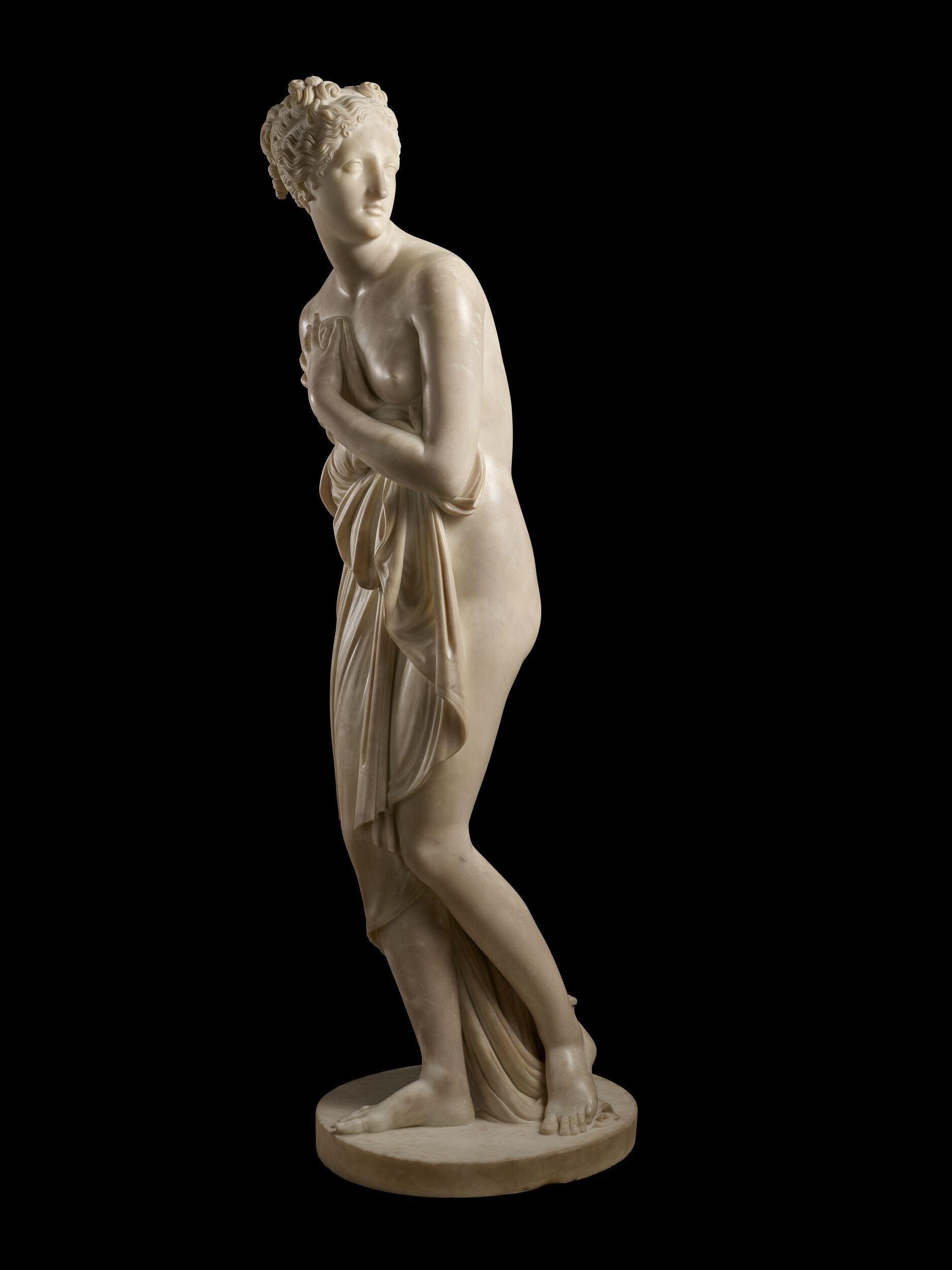 The Venus Italica was commissioned by Napoléon Bonaparte , 3 versions were made between 1802 and 1819. The work was to serve as a replacement for the Venus de Medici sculpture, a copy of an antique work by Cleomenes of Athens, which had been seized, taken to France and placed in the Louvre in 1802 by orders of Bonaparte. After Napoleon's abdication the Venus de Medici was returned to Italy in 1815 and is since on display in the Room of Venus in the Galleria Palatina in Florence. It has been observed that the work conveys the artistic expression of sexual vulnerability aided by Canova's unique technique and ability to achieve the illusion of human flesh has been called the Direct touch Finally he would apply an unknown compound of patina onto the flesh of the sculpture to lighten the skin tone. This process has been called the Last touch. Canova would eventually begin to display his studio works in candlelight. Intrigued by the effects of the light and shade of the candles on the translucent marble surface Canova soon began to further soften the transitions between the various parts of the statue and rub them down with special tools and pumice stone, sometimes for weeks or months.